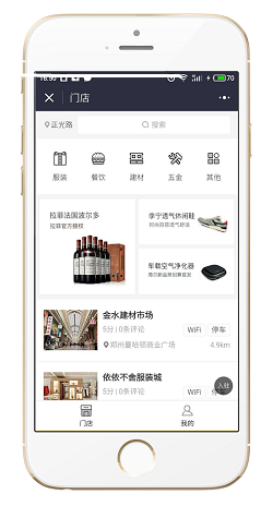 用户打开小程序后,系统会自动定位小程序的地理位置并以距离的远近来对多门店进行排序,用户可以选择离他最近的门店,并查看其所提供的商品信息和服务信息,来决定是否去门店进行消费。