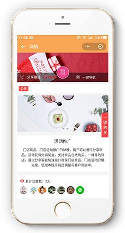 门店商品、门店活动推广的神器,用户可以通过分享商品、活动获得分销奖金,支持商品在线购买,一键导航到店,通过分享裂变快速提升商家门店商品、门店活动的曝光度,低成本提升商品销量与客户到店率。